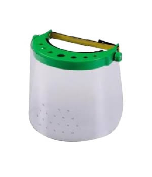 Visiera protettiva per decespugliatore con schermo in plexiglass e fori centrali traspiranti.